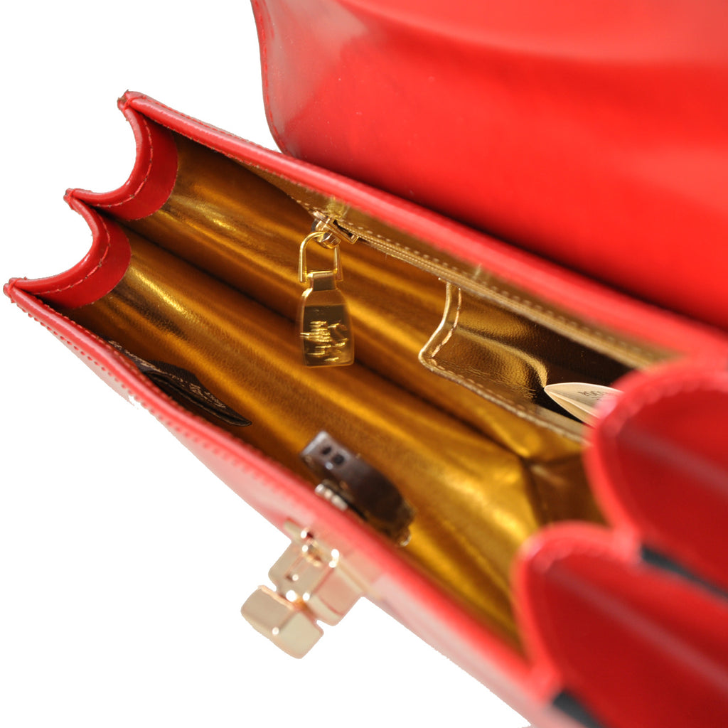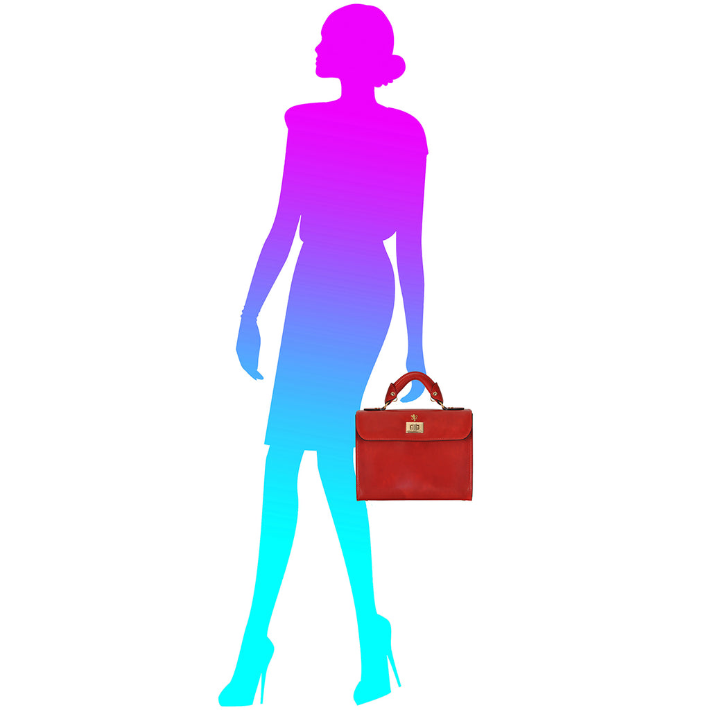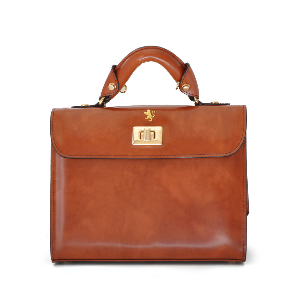 La borsa a mano Lucignano è una borsa realizzata al 100% in pelle di vacca trattata secondo la tradizionale moda Pratesi Pelleteria (utilizzando solo ingredienti vegetali) ed è disponibile in una varietà di colori. Dotata di un robusto manico con accenti metallici color oro, la classica tracolla e la chiusura a lucchetto abbinata, la borsa Lucignano è realizzata a mano a Firenze utilizzando la tradizionale lavorazione artigianale che Pratesi Pelleteria ha perfezionato dal 1948. Fa parte della serie di borse Radica. L'interno contiene una luce led per organizzazione e praticità. Le cuciture invisibili sono realizzate nello stesso colore della pelle in cui è realizzata la borsa e rifinite con bordo nero.