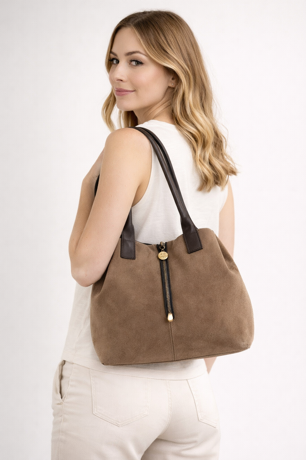 Genuine leather, Made in Italy, double handles and detachable shoulder strap, zip closure. Inside: blended polyester and cotton lining, zip pocket and smartphone pocket. Dimensions: 30x26x16. Ref: 885276.