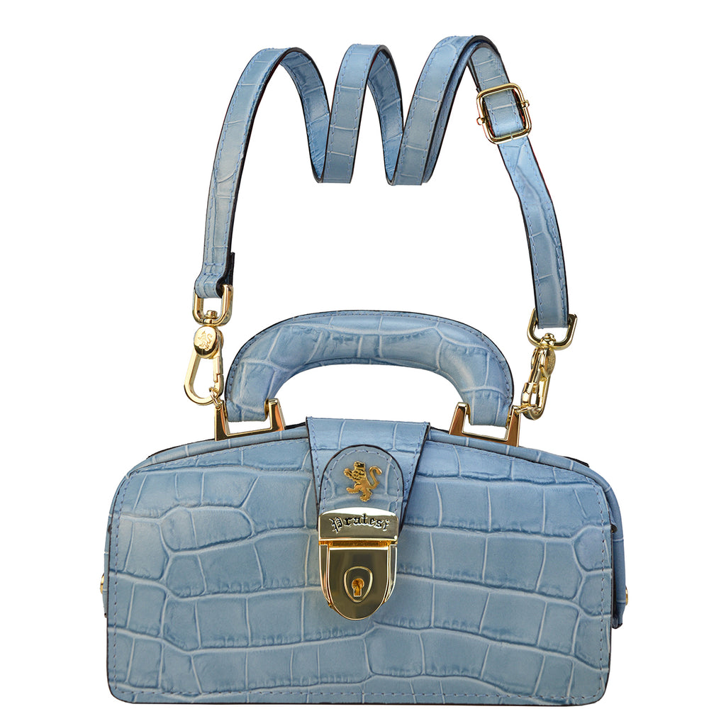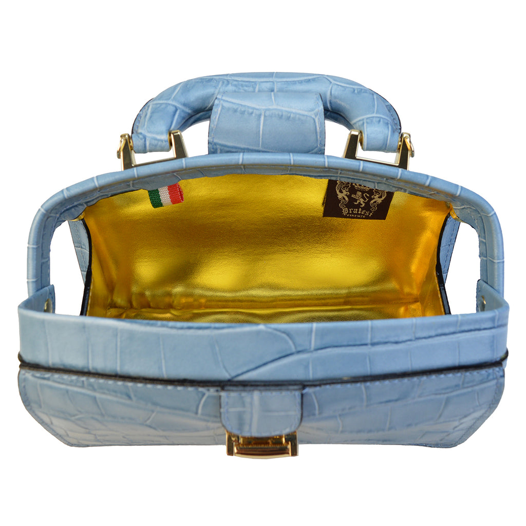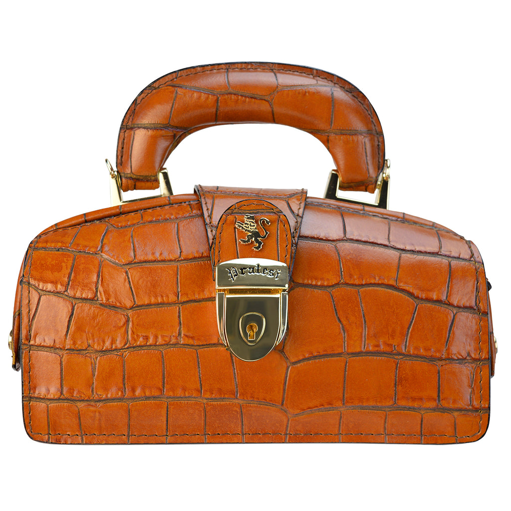 Brunelleschi Mini by Pratesi, in genuine Italian leather. Made of certified calfskin, it is 100% handcrafted. This ancient tanning process that uses only natural products (tannin, tallow, etc.) is unique in the world and has never been reproduced. Items made with this leather have the characteristic of aging over time, acquiring more and more charm day by day. The first aging was done by us, applying various waxes and other natural products, the formula of which is secret. Precious and cared for in the smallest details, the Lady Brunelleschi handbag elegantly accompanies every type of outfit. A classy bag, completely Made in Italy signed by the historic Florentine brand Pratesi. Compact in its linear shape and dry profiles, it combines class and versatility. Lady Brunelleschi is a handbag with a large compartment with a key lock, inside, on one side, there is a pocket with a zipper closure, on the other side there is a timed light. The metal parts are gold-colored. Including a removable shoulder strap, and a cotton bag for storage. Pratesi, when the quality of Made in Italy meets an exclusive and timeless design, since 1948. Pratesi bags are available in many colors: Black, Brown, Yellow, Cherry, Chianti, Cognac, Purple, Gray, Orange, Dark Green, Electric Blue, Cream, Coffee, Emerald, and the brand new Peach.